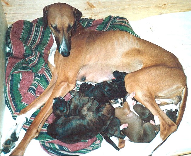 Ausstellungen waren bei Tobol sehr unbeliebt und im Showring tat sie ihren Unmut stets mit lautem Jaulen kund. Meine Freude daran , sie auszustellen und auch der Erfolg hielten sich dementsprechend in Grenzen und die „Showkarriere“ wurde in beiderseitigem Einverständnis recht schnell beendet. Immerhin erhielt sie 3 x CAC und wurde Landessieger Hessen Thüringen 1993. Im Februar 1994 brachte sie dann den ersten Tombouktou´s – Wurf (2/3) nach dem gestromten Rüden Al Hara´s Zeroumi (Kel Tarbanassen Firhoun x Reckendahl´s Innana) zur Welt. | |